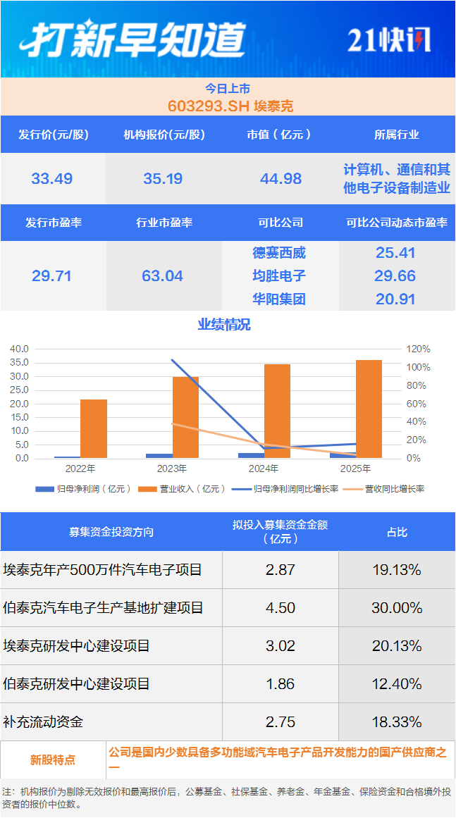 4月16日,有三只新股上市,為滬市主板的埃泰克(603293)(603293.SH)、創(chuàng)業(yè)板的大普微(301666)(301666.SZ)以及北交所的恒道科技(920177.BJ)。