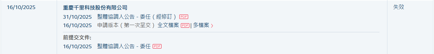 重慶千里科技(601777)股份有限公司(簡(jiǎn)稱(chēng):千里科技(601777)(601777.SH))于2025年10月16日所遞交的港股招股書(shū)滿6個(gè)月,于2026年4月16日失效,遞表時(shí)中金公司(601995)為其獨(dú)家保薦人。