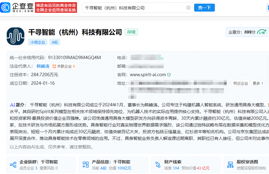 企查查信息顯示,千尋智能成立于2024年,法定代表人為韓峰濤,經(jīng)營(yíng)范圍包括智能機(jī)器人的研發(fā)、服務(wù)消費(fèi)(883434)機(jī)器人制造、智能機(jī)器人銷售等,是一家專注于構(gòu)建機(jī)器人“通用大腦”的具身智能公司。
