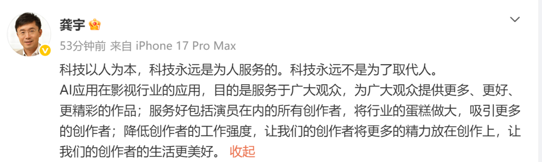 針對4月20日網(wǎng)傳“龔宇說未來真人實拍可能會成非遺”這一話題,龔宇也上傳了現(xiàn)場視頻。